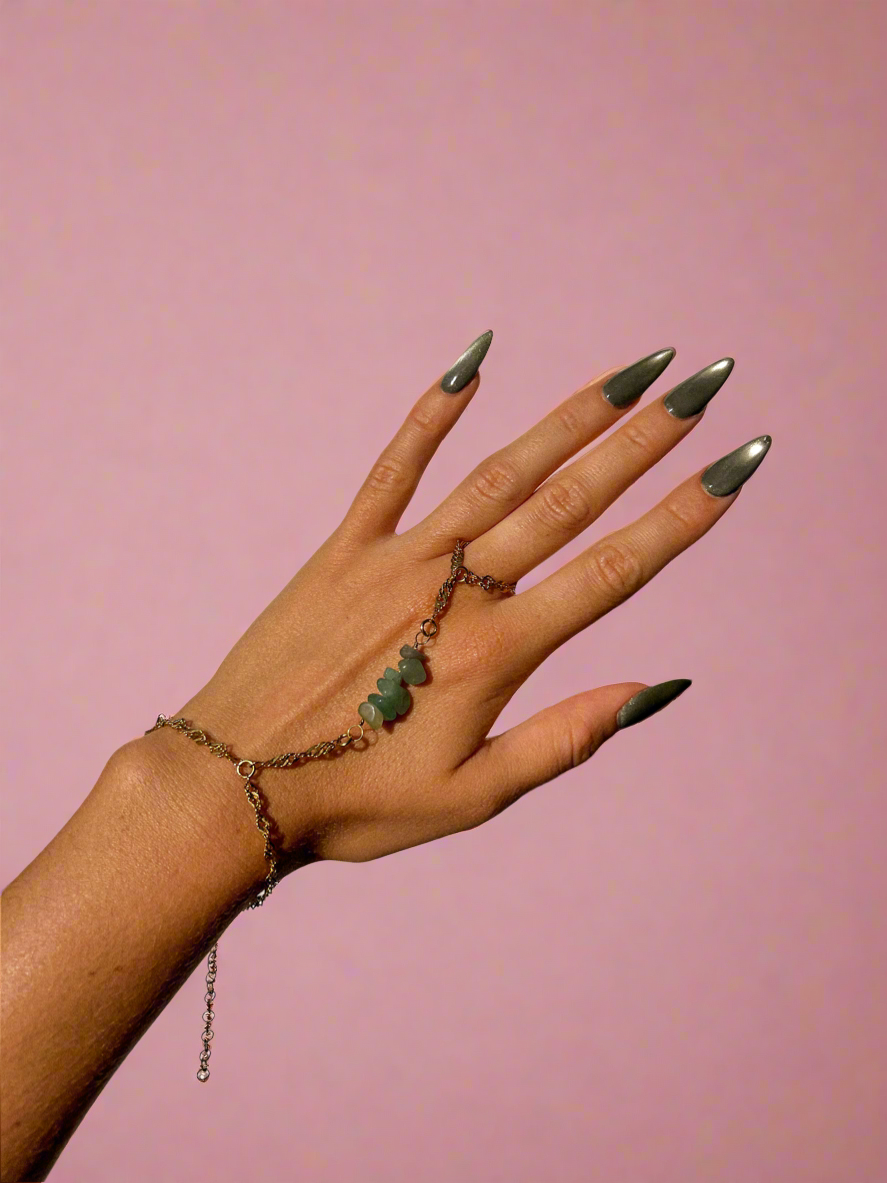 Bijoux demain avec pierre Aventurine, entièrement en acier inoxydable doré. Le bijou est réglable au poignet.